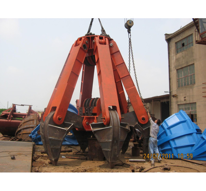 3. Touch-down grab is a single rope grab, it must be put on the ground, cargo or hopper when you open it. After the crane lifts up, the grab will open by itself. The grab has buffers, which can reduce the impact when it opens. The opening and closing system is simple, so it has low fault rate.